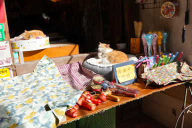 お土産屋の店頭で猫が日なたぼっこ。