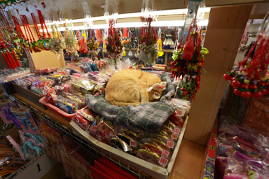 お土産屋さんの商品の上で、猫が熟睡中。