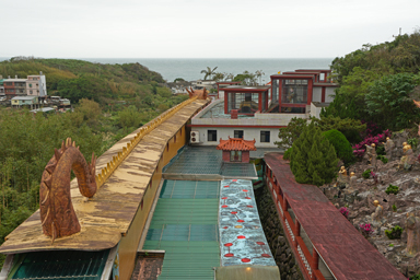 (左)お寺を上から見ると、海へと向かう龍になっている。