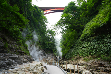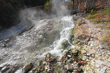 細くて深い谷を降りていくと、蒸気が噴き出した熱々の川があります。